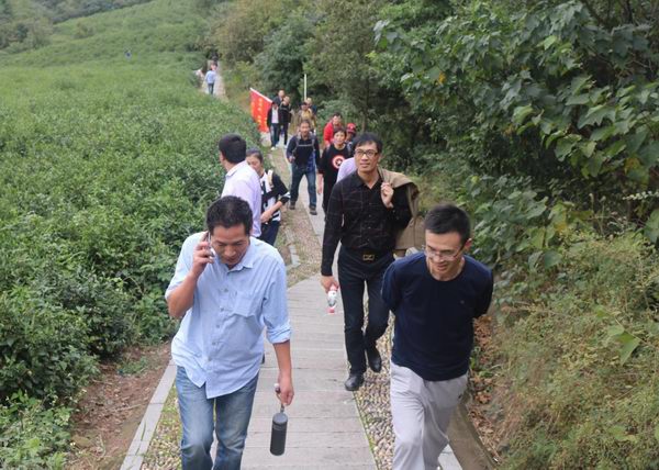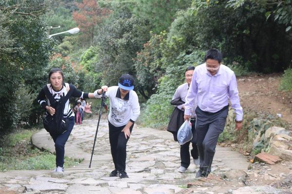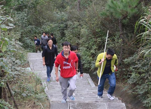 8:50,集结完毕,大家开始出发!起始路段为上坡阶梯,约占全程的四分之一,系全程最耗费体力的路程。在该路段,大家体力充沛,三步并做两步,一路上有说有笑,工作、生活无所不谈。